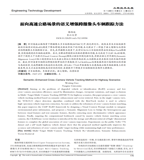 地球科学学院硕士研究生郭玮廷在《工程技术发展》上发表题为“面向高速公路场景的语义增强跨摄像头车辆跟踪方法”的研究论文。长江大学地球科学学院为论文第一署名单位,硕士研究生郭玮廷为论文第一作者。