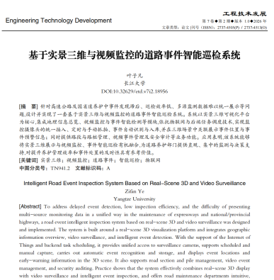 长江大学硕士研究生叶子凡以第一作者身份在国际开源期刊《工程技术发展》上发表题为《基于实景三维与视频监控的道路事件智能巡检系统》的研究论文。长江大学为论文第一署名单位,硕士研究生叶子凡为论文第一作者。