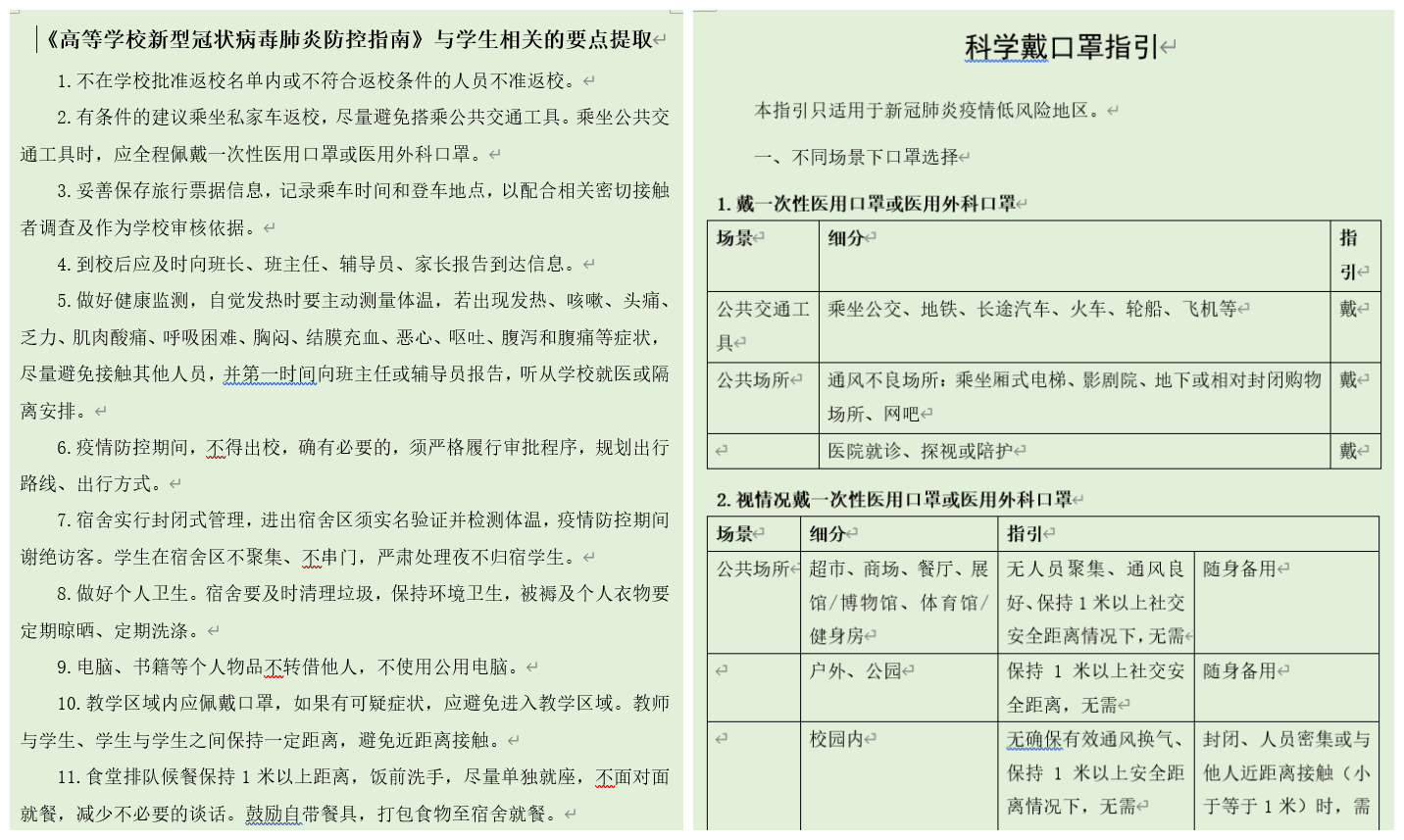 (通讯员:郭霖)根据当前常态化疫情防控形势和复工复产复学需要,我院全体学生于5月27至31日学习了《公众科学戴口罩指引(修订版)》、《夏季空调运行管理与使用指引(修订版)》和《高等学校新型冠状病毒肺炎防控指南》三个疫情防控文件。为保证学习效果,学工办老师在认真研读文件的基础上,根据将来学生复学返校可能面临的防控重难点,结合学院学生具体情况,对文件内容进行了梳理与提炼,整理出相关学习要点,由年级辅导员具体负责组织学生学习。