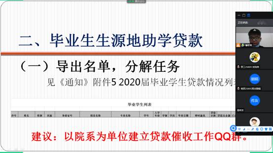 建立一本毕业贷款学生工作台帐、建立一个毕业生贷后管理工作群和工作机制。6月18日晚7点半,辅导员潘志远老师针对16级生源地贷款同学在腾讯会议上开展“诚信还款”培训会议。会议深入宣讲了生源地贷款还款流程,对毕业生毕业确认等贷后管理工作进行细致安排,加强了毕业生诚信还款教育。