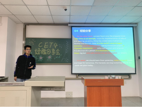 孙仁校在分享经验时强调“过四级要趁早”,并就同学们“听力听不懂”、“阅读时间不够”、“作文怎么写”、“翻译无从下手”等问题为大家支招。例如听力要找关键词;阅读要认真审题,在题干中找到关键词再回到原文找答案;作文要注意语法词法,要做到作文层次分明、结构清晰、内容丰富;翻译尽量用简单的词法语法,要注意一一对应等。最后,他着重强调备考的重要性,希望同学们坚决不裸考,争取得到满意的成绩。