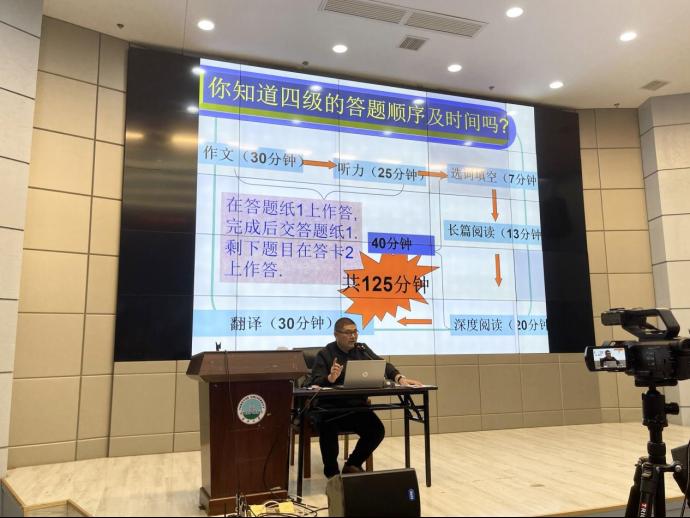 (通讯员 王佳颖)为助力学生顺利通过英语四级考试,我院分别于4月14日、19日、27日晚6点半在石油科技大楼学术报告厅开展了“新文道”讲座,三次讲座分别从阅读、写作、听力三方面进行了技巧解析。