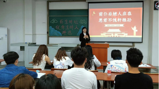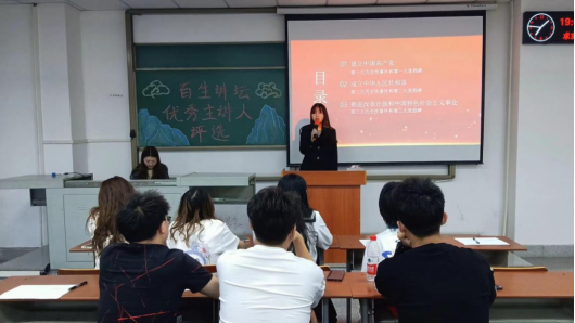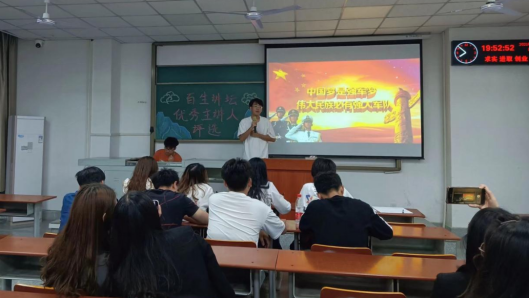 (通讯员 王铃淇)为进一步学习贯彻习近平新时代中国特色社会主义思想和庆祝建党一百周年,我院于5月5日晚7时在A教306开展以“青春心向党,建功新时代”为主题的百生讲坛活动。此次活动由团委学生会主席郑娜主持,学生会全体部长参与此次活动。