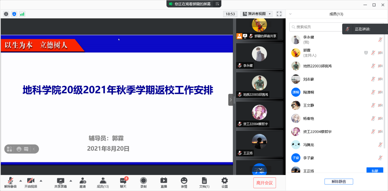 (通讯员 李永健)为确保2021年秋季学期开学返校工作平稳有序开展,我院按照疫情防控要求以及8月15日学校发布的《关于做好2021年秋季学期开学准备工作的通知》,于8月20-22日用腾讯会议的形式在全体学生中召开了“地科学院2021年秋季学期返校工作安排”主题班会。