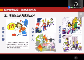 接下来,由地物学院荆鑫老师讲解有关防盗、防火、防溺水的注意事项。他以校区曾发生的真实事故,让同学们有了更真切的感性认识,并提醒同学们积极参加校区消防演习,了解逃生常识,对违规电器等可能引发事故的危险因素保持警觉。