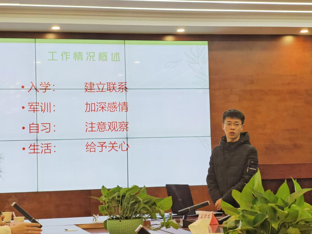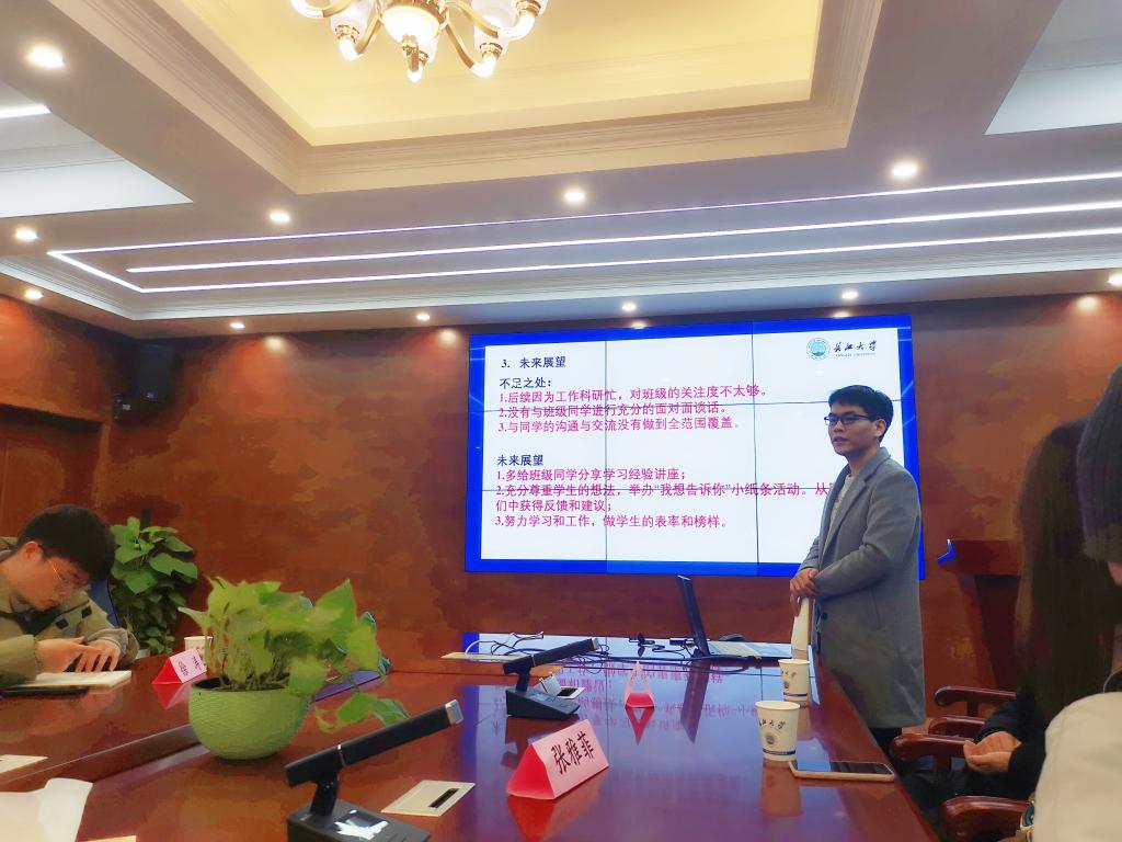 在简短的自我介绍后,地物学院三位嘉宾分别分享自己带班的经验体会,讲述了送诊发热学生、找高年级新疆籍学生帮助新生老乡更好的适应本地气候等问题的事例,及对“班导、班委配合”等方面的思考。随后我院班导依次上台,通过PPT用数据、图文生动展示了新生入学以来的学习、生活情况以及班导们在引领团学工作、班级团建、学风建设等方面的特色方法,包括每天发布“军训日记”、利用班团会为班内同学庆祝生日加强班级凝聚力、用“群作业”功能收集截图保证青年大学习完成率、自编地学知识小测验提高学习积极性、坚持陪伴早晚自习将学风渗透在言行举止中……各种别出心裁的做法让大家在交流中,有了新办法,新收获。分享后班导们就自己工作中的问题,积极提问交流,直到九点半还意犹未尽。