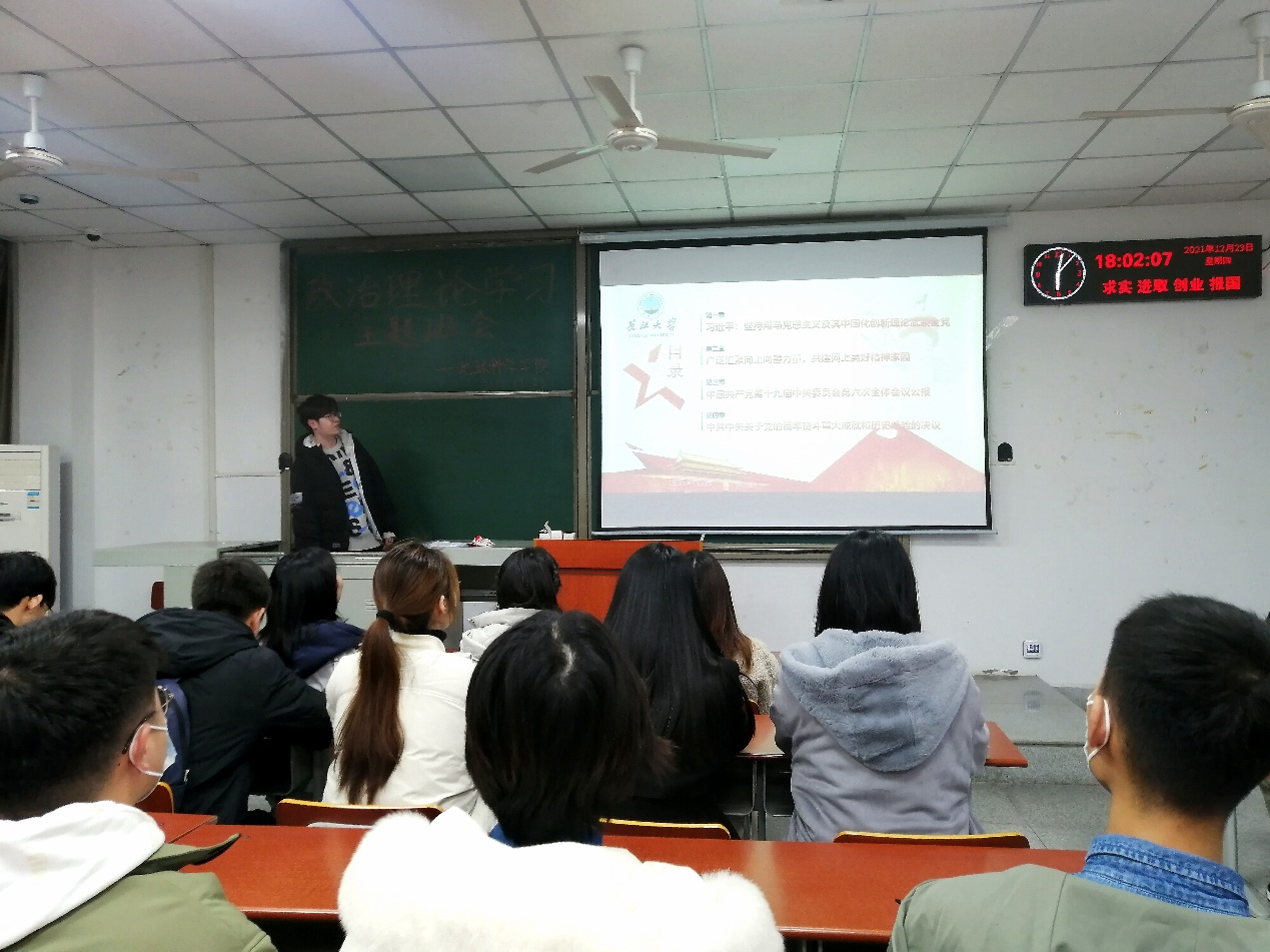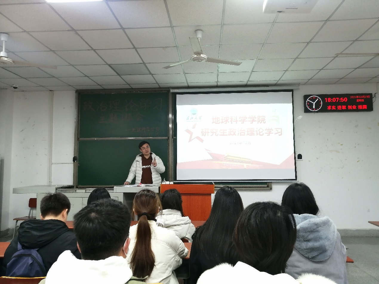 (通讯员 古楠玲)不忘初心,牢记使命。地科学院积极响应政治理论学习活动的号召,从12月11日至12月30日,开展了以班为单位组织学习,线上、线下相结合的政治理论学习活动,并于12月23日晚,在B-202教室集中进行了线下政治理论学习活动。此次学习由地科学院学工办兼职辅导员梁博主讲,研究生会主席陈剑峰主持,全体研究生参加。