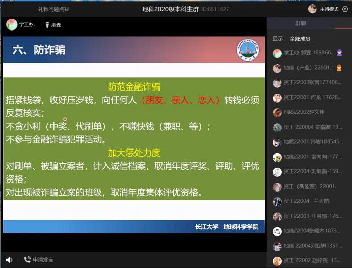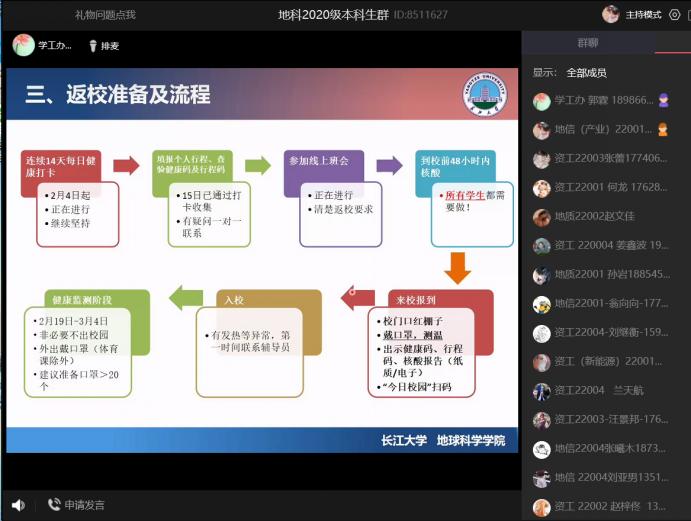 (通讯员 李永健)为确保2022年春季学期开学返校工作平稳有序开展,我院按照疫情防控要求以及学校2月12日发布的《关于做好2022年春季学期开学准备工作的通知》,于2月15、16日通过QQ群课堂、腾讯会议等形式分年级在全体学生中召开了“地球科学学院2022年春季开学工作”主题班会,会议由各年级辅导员负责,各班主任参会。