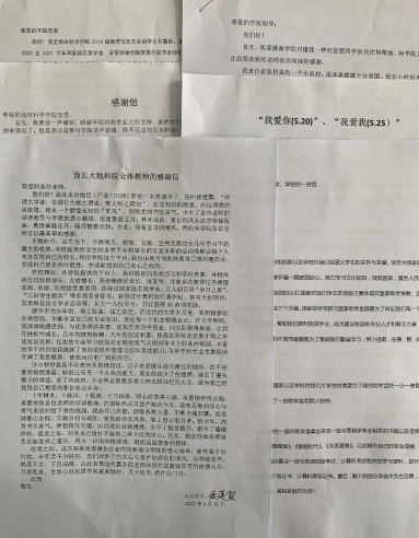 一纸书信,以物承载,传递美好,传递感谢。以“我爱你(5.20)”、“我爱我(5.25)”为主题,地科学院倡导全体获得奖助学金学生给资助人和学院党委以及家长写信,用一封充满真情的信件表达自己的感恩之情,汇报自己的生涯规划。以爱之名,抒感恩之心,以信为名,以物之形,传递感情。希望以此为契机激励广大学子怀感恩之心,努力完成学业,感恩他人,感恩社会,感恩国家,做一名有理想有担当的大学生。