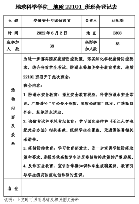 (通讯员 周再文)为有效预防疫情传播,确保学生身体健康和生命安全,6月1日至6月,我院以班级为单位,充分发挥年级辅导员、班主任在安全教育中的引领作用,通过主题班会等形式,广泛开展学生疫情防控教育与安全教育班会,从严从紧、落实落细学校对于疫情防控、毕业生安全离校、防溺水、学生四六级以及诚信教育等相关工作要求,全力守护校园安全稳定。