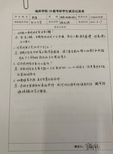 为帮助学院2019级本科生充分了解当前考研形势,明确考研目标,扎实推进学院2023届毕业生考研及就业工作,我院积极组织2019级班主任,主动面对面约谈学生开展考研动员工作。