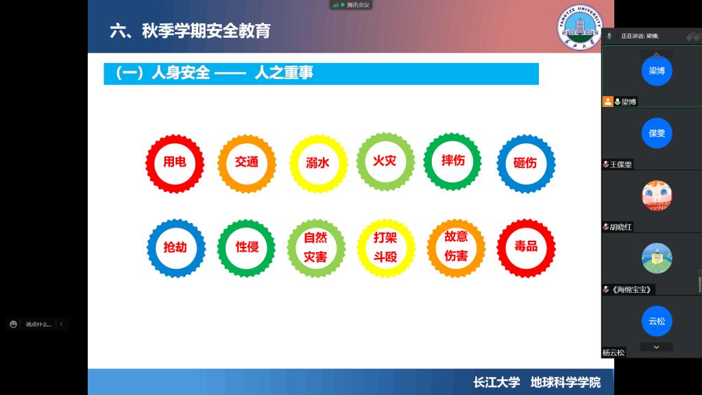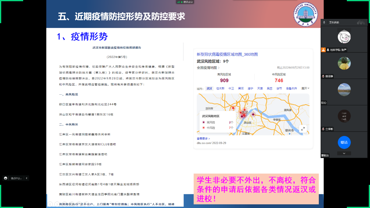 为应对当前严峻的疫情防控形势,做好国庆节及秋季学期安全教育,提高同学们的安全防范意识,根据研工部的统一部署,我院于9月29日通过线上召开研究生安全教育主题班会。