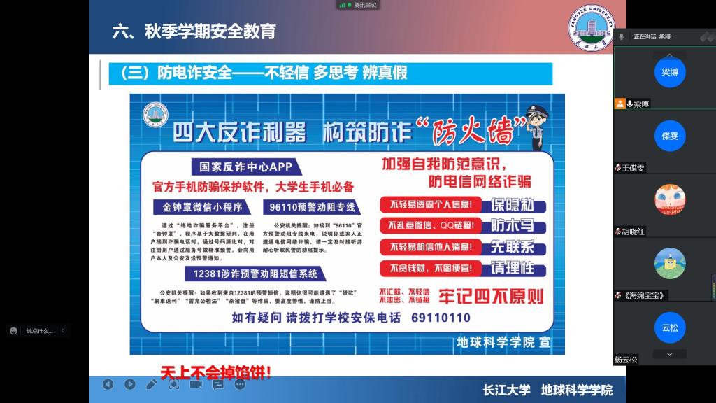 会上,辅导员传达了学校关于国庆节期间安全管理规定,讲解了当前学校疫情防控政策,要求同学们积极配合疫情防控工作,坚决落实学生个人疫情防控主体责任。而后,还通过安全知识讲解和案例分析对学生进行安全教育,强化学生在人身安全、消防安全、防电诈安全、防溺水安全等方面的意识,提升学生安全处置能力。