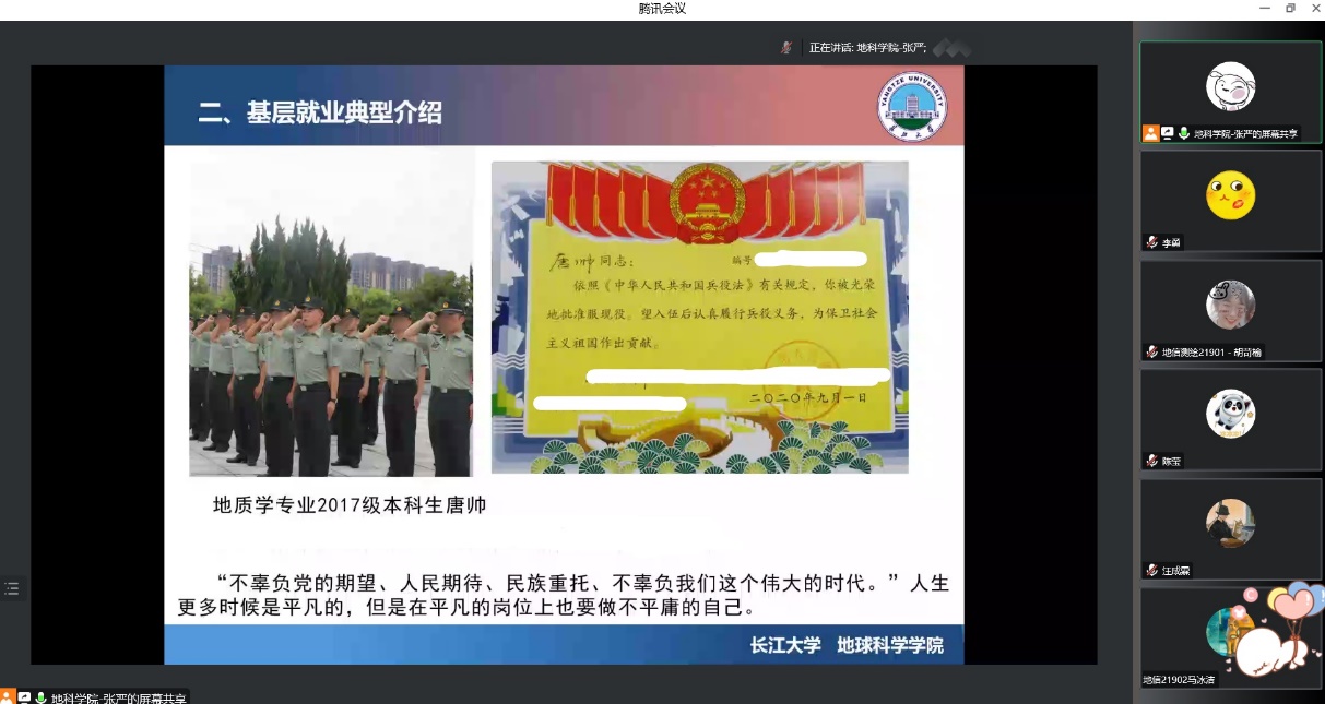 在就业育人主题班会上,学院以21届优秀毕业生左逸楠、唐帅为例介绍了基层就业典型案例,讲述了毕业生通过考取公务员和参军入伍等职业途径在基层发光发热的优秀事迹,引导学生做新时代新青年,把个人理想追求融入到党和国家事业之中,树立崇高的职业理想,鼓励更多毕业生到基层去、到西部去、到祖国需要的地方去建功立业、实现人生价值。