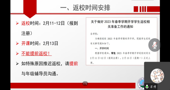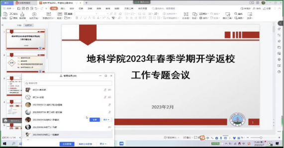 为了开好本次班会,我院学工办全体老师于2月1日晚集中开会讨论,并拟定《地科学院2023年春季开学工作实施方案》、主题班会PPT、2023春季学期返校申请表等文件,力求将开学返校工作抓严、抓细、抓实。