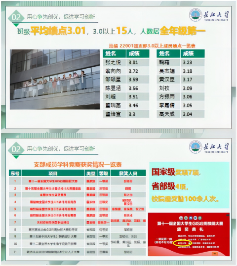 建设优良的学风,营造良好学习环境,是班级建设的重中之重。自开学以来来,同学们互帮互助,勤于开动脑筋,建立了“零挂科辅助集团”,致力于为同学们答疑解惑、分享解题思路。同学们善于向老师提问,认真完成作业。整个班级学习风气浓厚,生机勃勃,与老师积极配合,课堂气氛活跃获得老师们的一致好评。大二学年,我班同学共有两人获得“长江大学一等奖学金”,两人获得“李建华一等奖学金”,两人获得“国家励志奖学金”,一人被评为“三好学生”,一人被评为“三好学生标兵”,一人被评为“十佳大学生”,共两人被评为“优秀学生干部”,多名同学获得“长江大学单项奖学金”,两人担任校级组织重要负责人的角色。全班平均绩点3.01,四级通过率100%,六级通过率60%。在各类考试中,严肃考风考纪,未出现一例违纪现象。全班最高绩点为4.63,专业前十名本班有三位同学,多名同学通过计算机二级等专业认证。在辅导员和班主任的管理下,严谨的学风铸就了不怕苦不怕累的拼搏精神,良好的学习氛围也使班集体在全校脱颖而出。我班同学获得“第十一届全国大学生GIS应用技能大赛”全国一等奖;“第十五届全国大学生计算机设计大赛”全国三等奖一项、省部级一等奖一项;“全国大学生英语竞赛”全国三等奖;“易智瑞全国大学生GIS软件开发竞赛”全国三等奖两项;“第三届湖北省GIS应用技能大赛”特等奖;“第十二届全国大学生电子商务三创赛”湖北省一等奖;“蓝桥杯全国软件和信息技术专业人才大赛”省级三等奖。目前共有超半数的同学参加大创项目,其中国家级项目一项,省级项目两项,共发表一篇核心期刊、一项软件著作权,其中国家级大创项目“麦朴志愿”已正式投入使用。