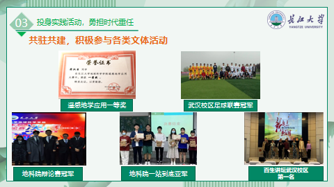 努力学习科学文化知识的同时,我们在一项又一项的课余文化活动中取得了可喜的成果。本班同学积极参加辩论赛,获得“班级辩论赛”冠军并且两位同学被评为最佳辩手、获得“地球科学学院励新杯”冠军、“清晓杯辩论赛”冠军,并作为评委被授予“优秀评委”荣誉称号……班级多次组织同学参加学校各类文体活动,如校级篮球赛、拔河比赛、跳大绳比赛、五四大合唱比赛等。学生会、大学生艺术团、国旗护卫队、社团联合会、蒲公英之家等各级各类组织,到处都有同学们靓丽的身影。丰富多彩的文体活动,既增强了团组织的凝聚力,又让全班同学在紧张的学习生活之余得到放松,身心健康发展。