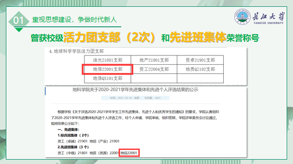 乘着和煦的秋风,2020年9月我们相聚在长江大学地球科学学院地信22001班这个温暖的大家庭。这是个团结友爱的集体,我们在这里欢笑、合作、携手共进。这是个朝气蓬勃、有着强大凝聚力的集体,我们在这只属于我们的大学岁月里挥洒青春!这是个投身社会主义建设的集体,我们在这里与人为善、帮扶他人。两年多以来,在学院领导、辅导员以及众多老师的关怀和指导下,全班同学以“团结、奋进、感恩”的班级精神,团结进取,齐头奋进,在思想,学习,生活,文体各方面都取得了优异的成绩。