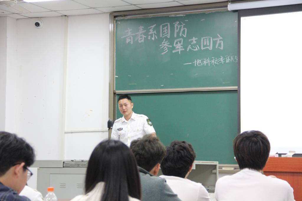 在宣讲会上,杨维鑫通过视频和照片分享自己的军旅经历和心得体会。在谈到自己入伍后的转变时,杨维鑫讲道:“自己最开始上大学时比较迷茫,不知道自己该做什么,每天都是浑浑噩噩;但在参军退伍后,明白了自己在哪方面存在不足,该向哪些方向努力,对自己人生也有了比较清晰的规划,所以在退伍后选择考研,最后成功上岸,这一段经历给了自己很多收获。”