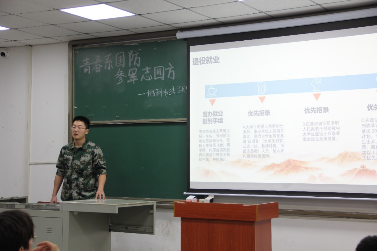 会议伊始,孙家振通过宣传短片向大家展示了部队训练和军旅生活;随后利用多媒体,从“青年寄语”“条件标准”“应征指南”“优待政策”“成长进步”等五个方面向大家宣传入伍政策,引导学生参军报国,不负韶华。