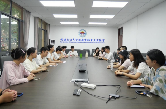 冀以尘雾之微补益山海,荧烛末光增辉日月。结束了逸夫博物馆的参观,实践队员们来到了地大东区信工楼319会议室,与近十名毕业于长江大学地球科学学院目前正在中国地质大学(武汉)读研的学长学姐,开展了主题为“芳华待灼,行而不辍”的座谈会。各位学长学姐热情欢迎实践队的到来,介绍了自己在研究生阶段学习、生活和科研情况,分享自己在本科阶段的专业学习经验以及学干经历,详细描述了出野外和在油田一线的场景与收获。
