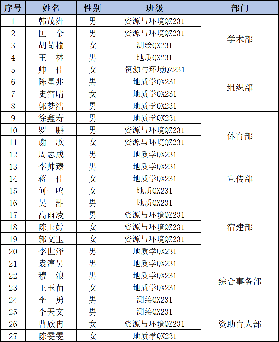 为推动我院研究生会工作有序进行,更好地开展新一学年院研究生会工作,本着“公平、公正、公开”的基本原则,经自主申请,面试选拔以及院团委审核,采取择优录取的方式,院团委、研究生会拟录用以下同学加入我院研究生会中,现将招新结果予以公示。