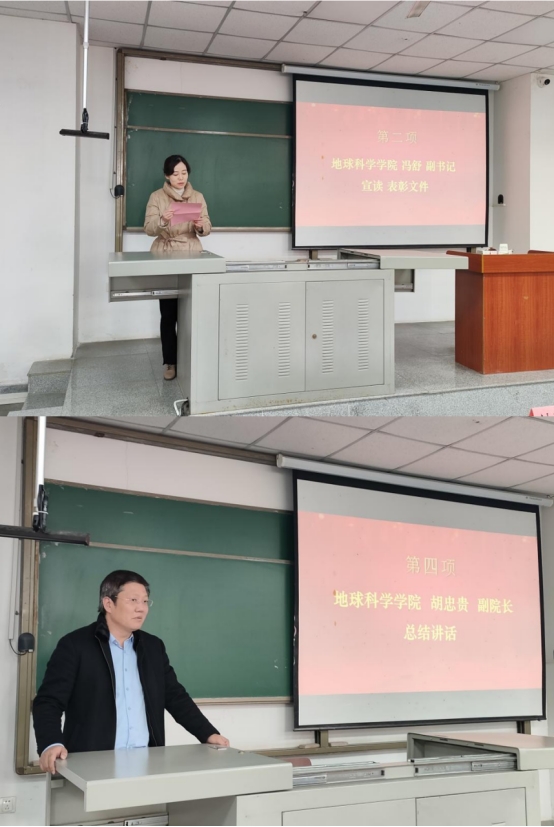 会议首先对22级英语四级考试中成绩优异的班级和同学进行表彰,由学院党委副书记冯舒老师宣读表彰文件,地球科学学院去年四级考试一次通过率为73.24%,其中地科22202与地质22202班的四级通过率均超过90%,且22级有三名学生四级分数超过600分。