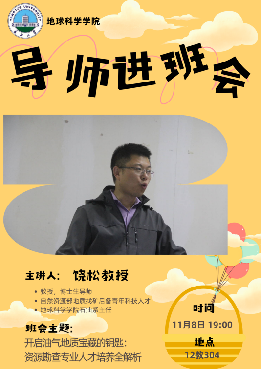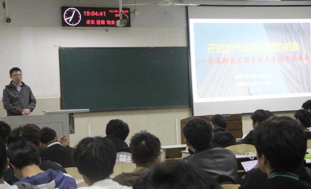 (通讯员 周文豪)为激发学生专业探索热情,助力学生知晓前沿资讯,促进我院学术繁荣。11月8日晚,我院石油系系主任饶松教授做客“导师进班会”系列活动,以“开启油气地质宝藏的钥匙”为主题在东校区12教304开展了精彩的主题班会,饶松教授、24级石油系全体本科生参会。