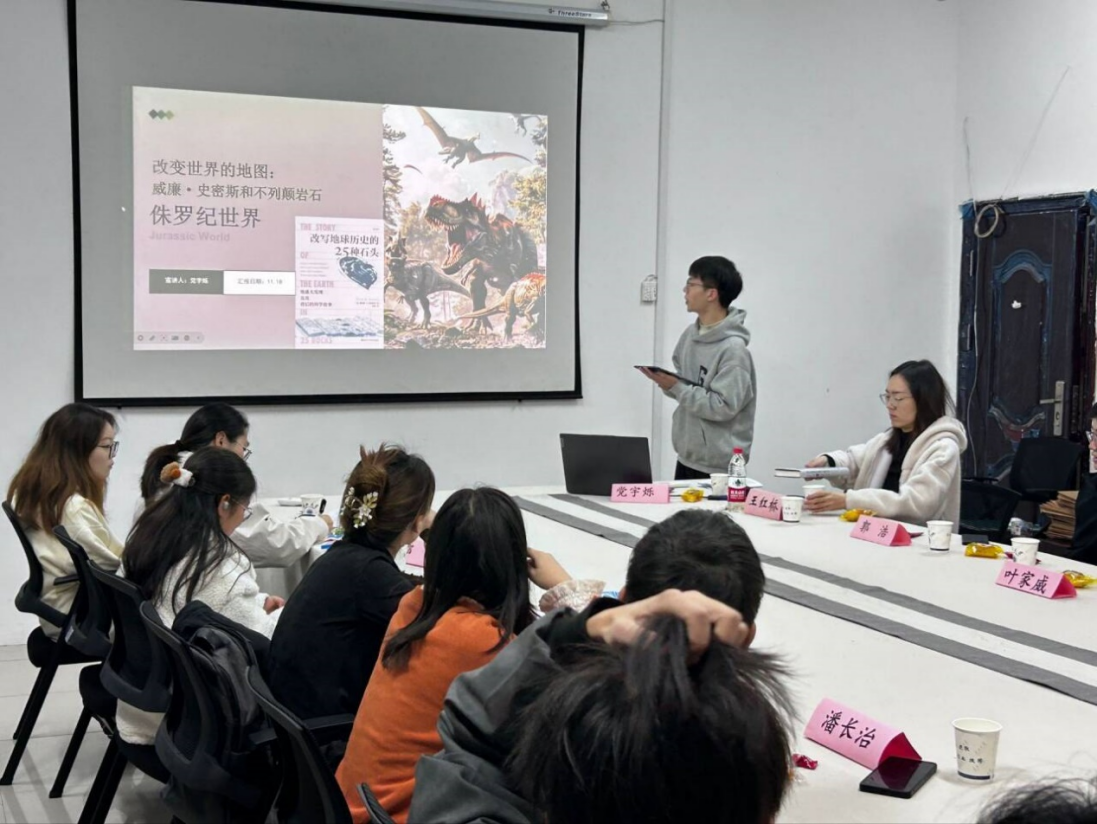 党宇烁同学作为主讲人,首先分享了《改写地球历史的25种石头》的“侏罗纪世界”部分,从威廉·史密斯的生平讲到他的多年耕耘对地球切片、化石层序律,及对地图学的影响。那个年代,作为一个勘测工人,农民出身的威廉在没有卫星地图、测距仪器的年代,用16年时间绘制英国和威尔士的地图,并揭秘地层顺序,带动了工业文明的发展和生物学的研究。同学们纷纷表示,在《构造地质学》课上,大家都学过制图,但对于地图的缘起,今天有了更深入的了解,也感受到了科学家的执着探索精神。