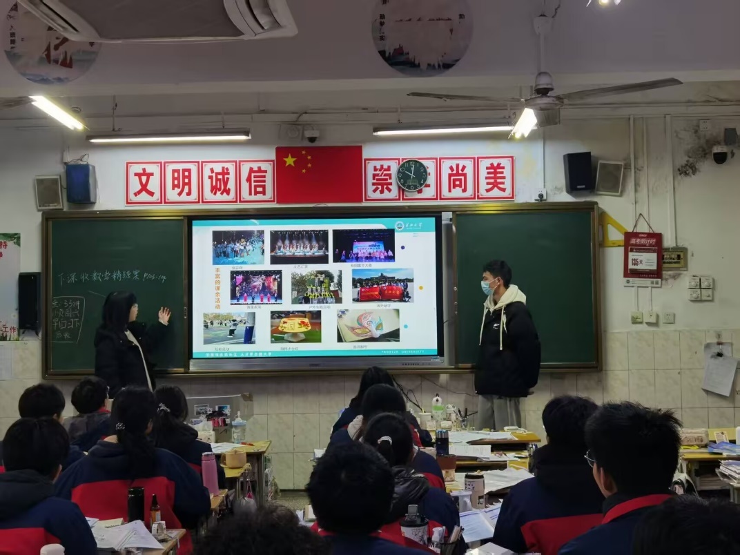 地信12401班的许康旺同学向母校的同学们分享了自己在长江大学的成长经历,介绍了学校的办学特色、学科实力和科研成果,搭建起了长江大学与高中母校之间的桥梁。在互动交流环节中,他耐心解答了学弟学妹们提出的关于录取分数线、专业设置及就业前景等问题。他的细致解答如同一针强心剂,为学弟学妹们紧张焦虑的高三生活带来了安慰与指引。