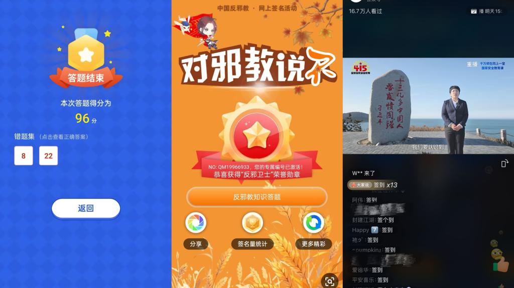 直播观看完毕后,我院各班纷纷开展了国家安全主题班会。在班会上,各年级辅导员、班主任老师与同学们一起观看了“反邪教警示教育进校园”视频。同学们围绕“日常生活中如何维护国家安全与防范邪教”展开讨论,并纷纷在“中国反邪教”公众号上进行网上签名,积极参与“全国大学生国家安全知识答题”活动,增强了同学们国家安全责任意识和社会责任感。
