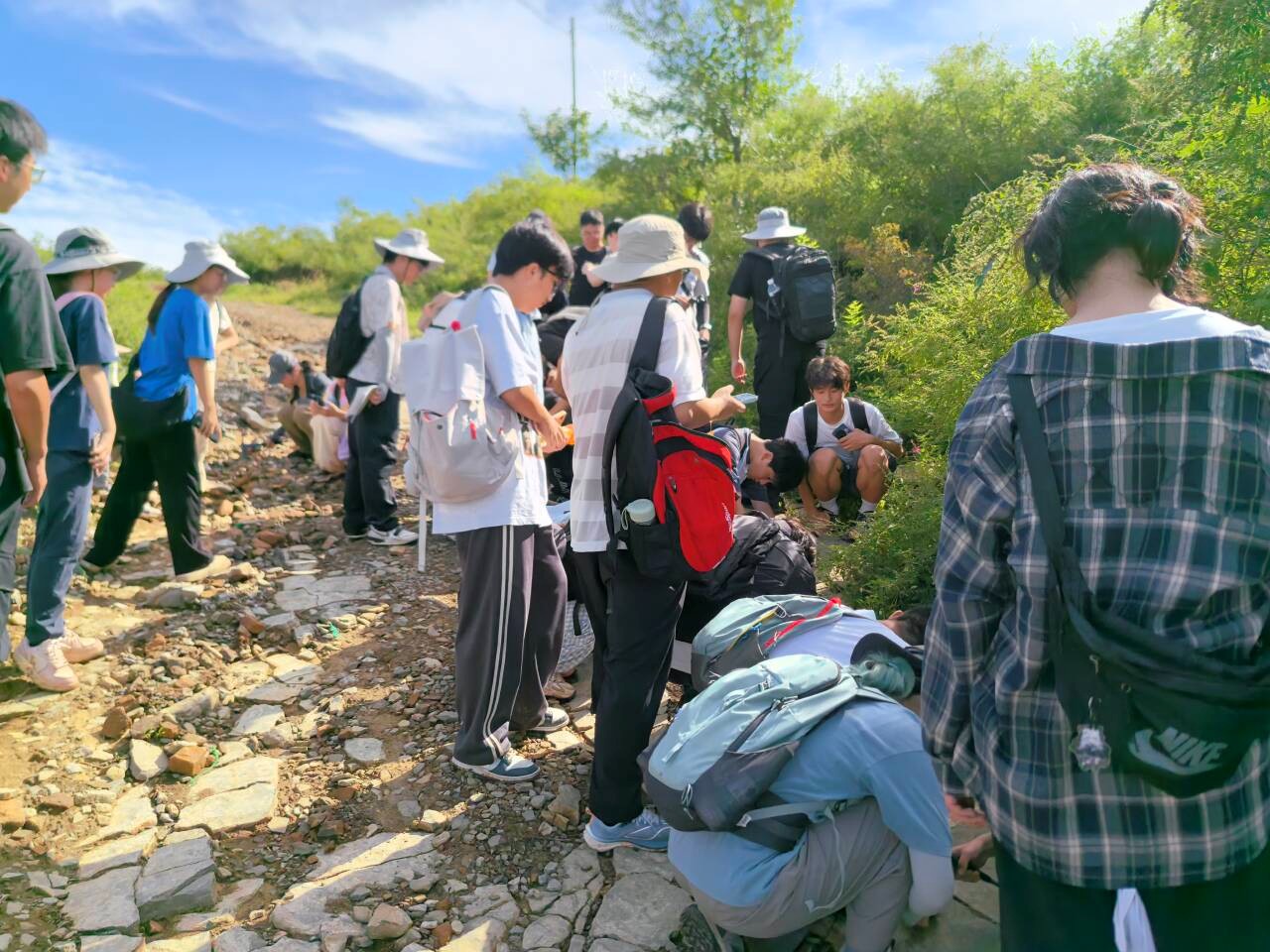 鸡冠山小断层、王铁庄小背斜、黑山窑角度不整合等明显的地质构造,让书本中抽象的概念活灵活现地出现在大家面前,地质(创新)22401吴天伊说:“实习路线中的岩层露头极为醒目,层层叠叠的岩石纹理清晰可辨。这得天独厚的观察条件,恰似一把钥匙,引领我们深入、直观地探索地质奥秘,令人受益匪浅。”实习采用小组合作模式,每三人组成一个地质小组。"我测量,你记录,他采样"各实习小组通过分工协作、群策群力完成实践任务,同学们培养了合理分工、相互校验、集思广益的能力,共同解决实际问题。