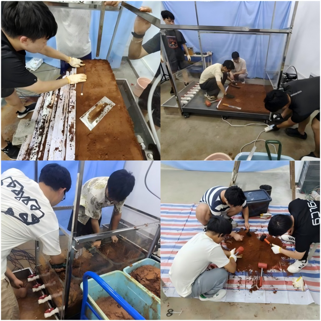 7月10日至28日,地质(工程)22201班何佳乐、杨振烨同学在张勃成老师和温韬老师团队的指导下,开展物理模型试验在降雨条件下模拟土质滑坡的实验。为确保实验的准确性,他们首先按照一定比例混合沙土,还原土质原样,随后将混合好的沙土按照 70°的坡度进行堆积。实验中,他们设置了有无公路对比的对照组,通过对比不同条件下的实验数据,深入研究降雨对土质滑坡的影响。整个实验过程中,他们密切关注滑坡发生的时间、位移及形变等数据,认真记录每一个变化细节。通过对这些数据的分析,他们希望能进一步探究土质滑坡的规律,为滑坡稳定性分析提供有力的实验支撑,为相关领域的研究积累宝贵经验。