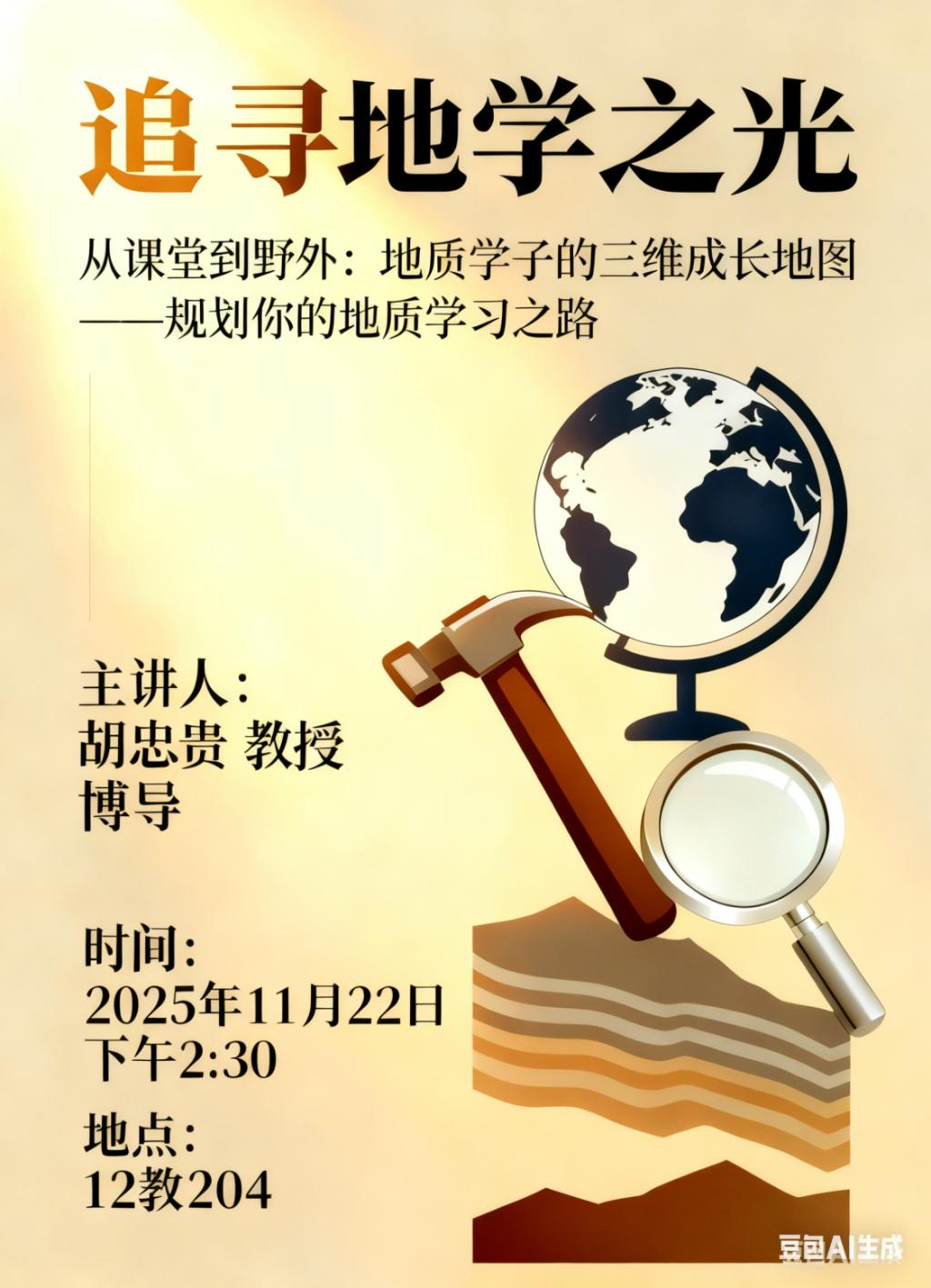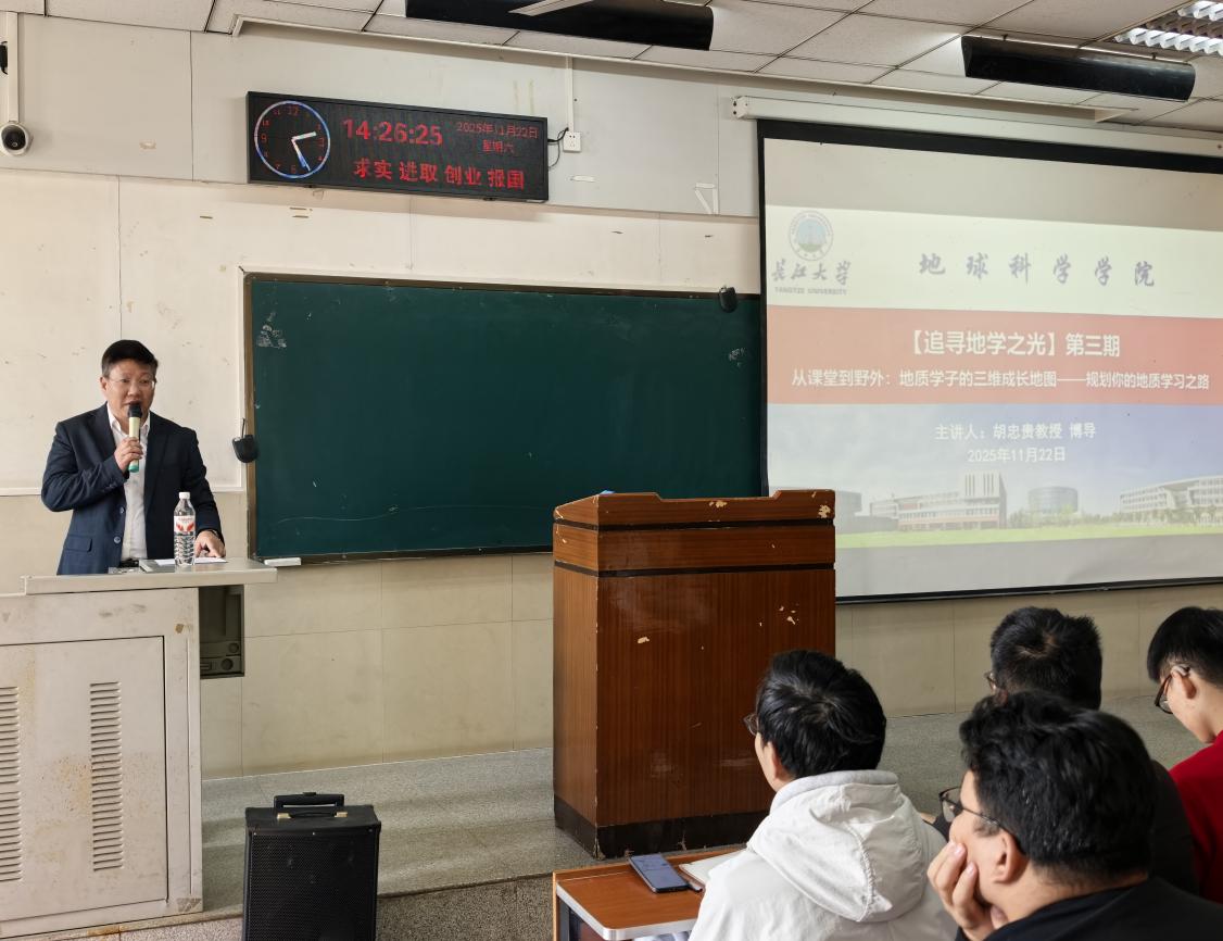 (通讯员 黄瑱/文 徐泽文/摄)11月22日下午,在东校区12教204室,地球科学学院副院长胡忠贵老师做客第三期“追寻地学之光”,开展了题为《从课堂到野外:地质学子的三维成长地图——规划你的地质学习之路》的讲座。全体2025级地质系、地科系同学参加,活动由年级辅导员黄瑱主持。