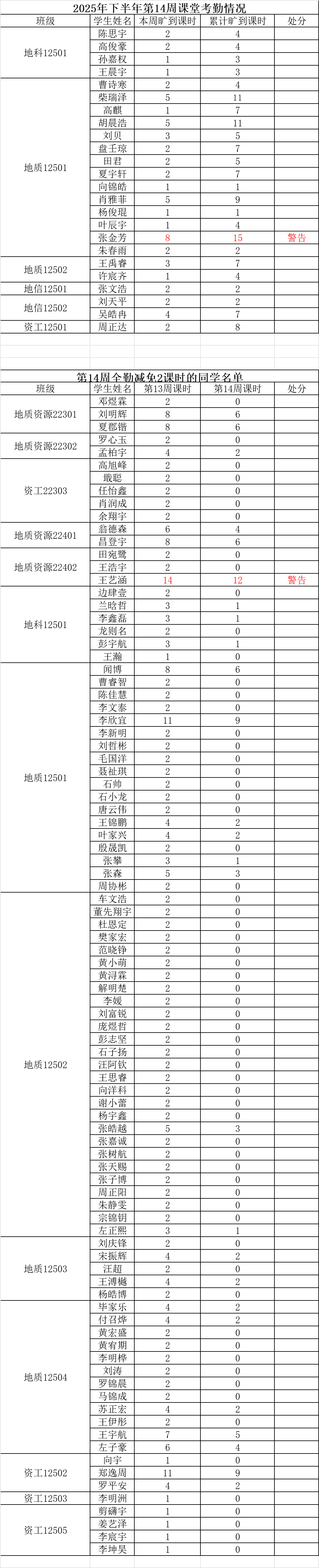 为落实学院关于加强学风建设的相关要求,进一步规范课堂秩序,营造良好的学习氛围,我院持续开展常态化课堂考勤工作。现将第十四周考勤情况通报如下: