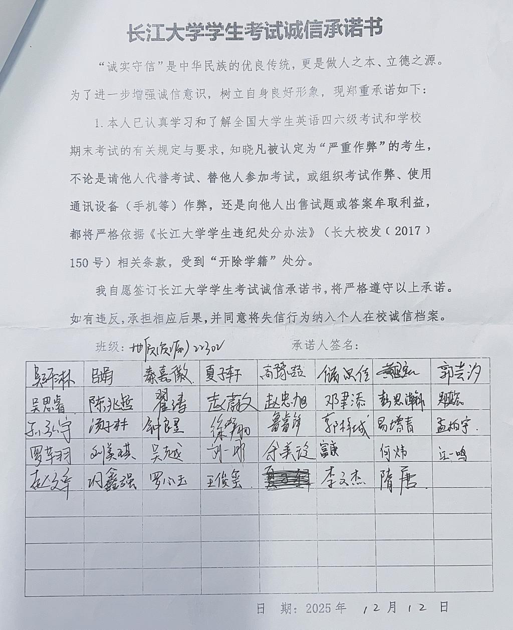 (通讯员 郭霖)为深入贯彻落实学校关于加强冬季消防安全教育与考试诚信教育工作的统一部署,切实提升学生安全意识与诚信素养,营造安全、和谐、公正的校园环境,我院于近期集中组织开展了2025年冬季消防安全教育与考试诚信教育系列活动。学院高度重视,精心组织,确保教育活动全员覆盖、取得实效。 12月9-12日,各班由班主任组织召开消防安全与诚信应考专题班会。班会上,老师们结合生动案例与详实资料,系统讲解了火灾的常见起因、致伤原理、灭火基本方法及消防器材的正确使用,重点强调了宿舍用电安全规范,严禁使用违规电器,提醒同学们离开宿舍务必切断电源。同时,班主任带领同学们深入解读了《长江大学学生违纪处分办法》《国家教育考试违规处理办法》等相关规定,通过剖析各级考试中的违纪作弊典型案例,深刻阐明了考试违规的严重后果,引导学生树立“诚信立身、诚信立学”的坚定信念,自觉维护考试公平公正。 在学院党委副书记的带领下,全体辅导员、班主任及学生干部组成专项检查小组,于12月11日前深入每一间学生宿舍,开展拉网式安全隐患排查。检查聚焦私拉乱接电线、使用违规大功率电器、存放易燃可燃物品、堵塞消防通道、损坏消防设施等重点问题,坚持即查即改,对发现的风险隐患建立台账,明确责任,限期整改。此次排查旨在彻底消除宿舍安全隐患,为学生筑起一道坚实的消防安全屏障。 作为诚信教育的重要环节,学院组织全体学生郑重签署《诚信应考承诺书》。承诺书的签署不仅是一纸约定,更是对学生自律意识与学术操守的强化。同学们纷纷表示,将自觉遵守考场纪律,摒弃侥幸心理,以真实学识和诚实态度迎接每一场考试,共同维护优良学风考风。 通过此次系列教育活动,广大学生的消防安全防范意识与自救互救能力得到有效提升,诚实守信、遵规守纪的观念进一步深入人心。我院将以此次活动为契机,持续关注学生安全与成长需求,不断优化教育管理模式,助力构建更加平安、文明、诚信的校园环境。 (审核 冯舒)