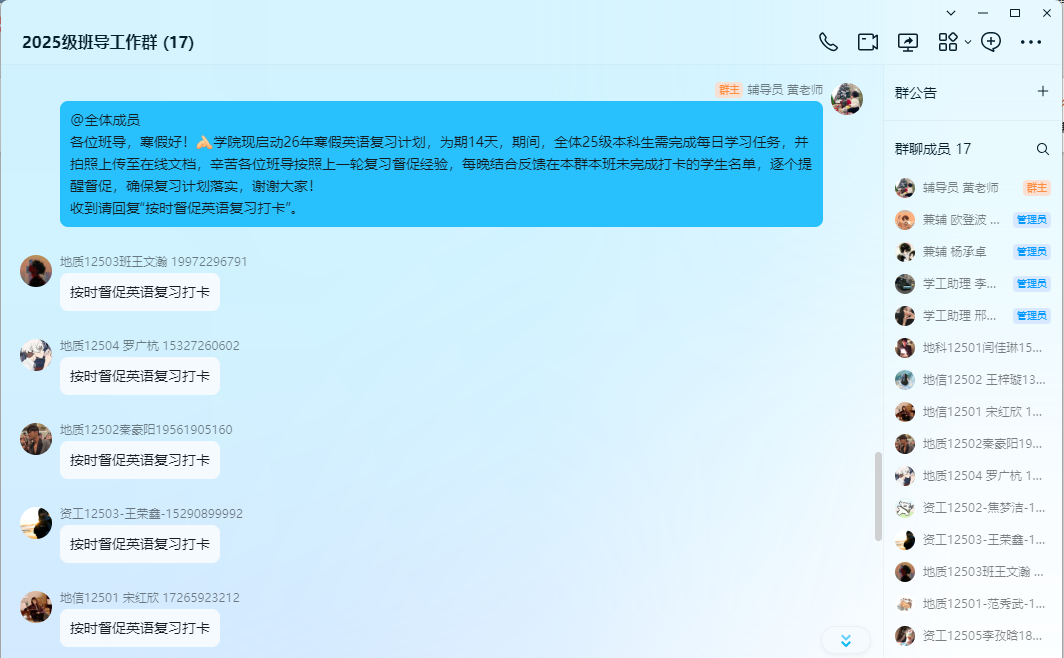 (通讯员 黄瑱)寒假第一周,25级学生就收到了 “寒假英语学习加油包”。本轮英语学习计划通过联动家长、班主任、班导,构建多层次、立体化的督学支持体系,推动学生度过一个充实高效的寒假。