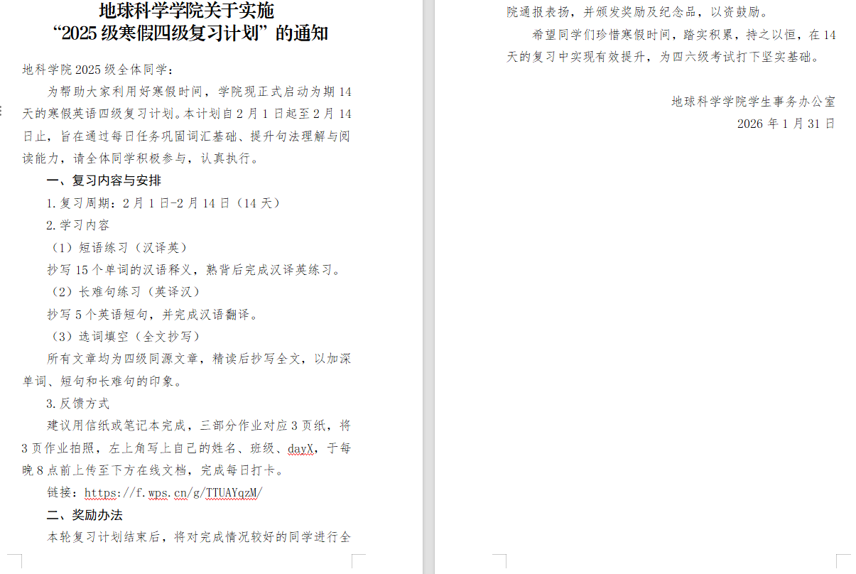 在内容安排上,本次复习以学院精心编写的“2026年寒假英语加油包”为核心,内容紧密对接四级考试要求:选用真题同源文章,帮助学生提前适应考题文体;提炼高频热点词汇,强化核心表达积累;解析长难句结构,提升阅读理解能力;并设置选词填空练习,推动“学—练—用”闭环,巩固学习成效。整套复习方案旨在巩固学生既有复习成果,系统提升应考能力。在督学机制上,由学院兼职辅导员、各班班长每日定时发布任务,学生于晚8时前完成并上传至指定平台,班导随即检查当日完成情况,做到“任务不过夜”;同时,辅导员、班主任开展定期检查,向家长群同步学习进展,形成全过程管理闭环。