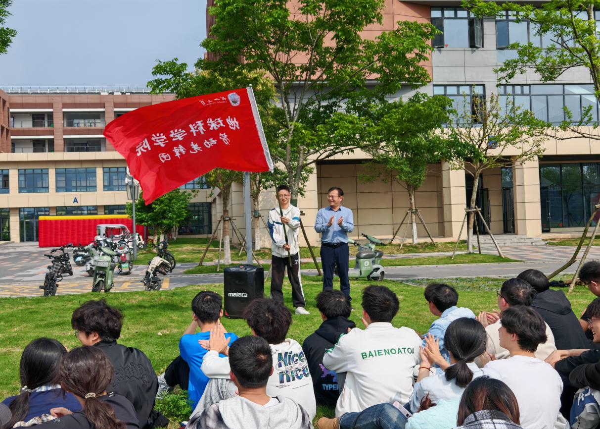 在同学们热烈的掌声中,平台与实验室管理处副处长丁四兵郑重接过旗帜,亲手交到学生代表手中。那一刻,红旗猎猎作响,不仅传递着一份荣誉,更寄托着对“劳动先锋团”的殷切期望。