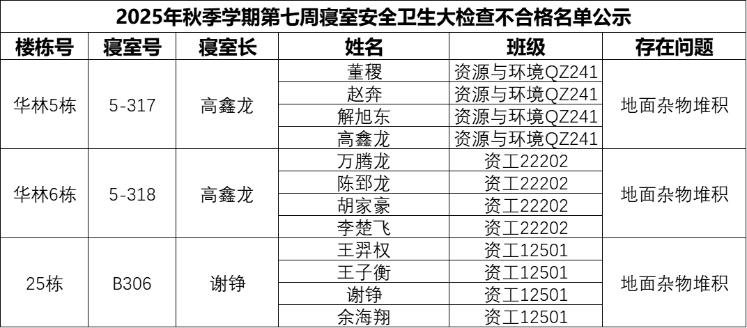 为加强学生宿舍安全管理和文明建设工作,确保学生宿舍安全、整洁、文明、有序,根据学校要求,我院于10月23日开展了第7周学生宿舍自查工作,现将检查情况通报如下