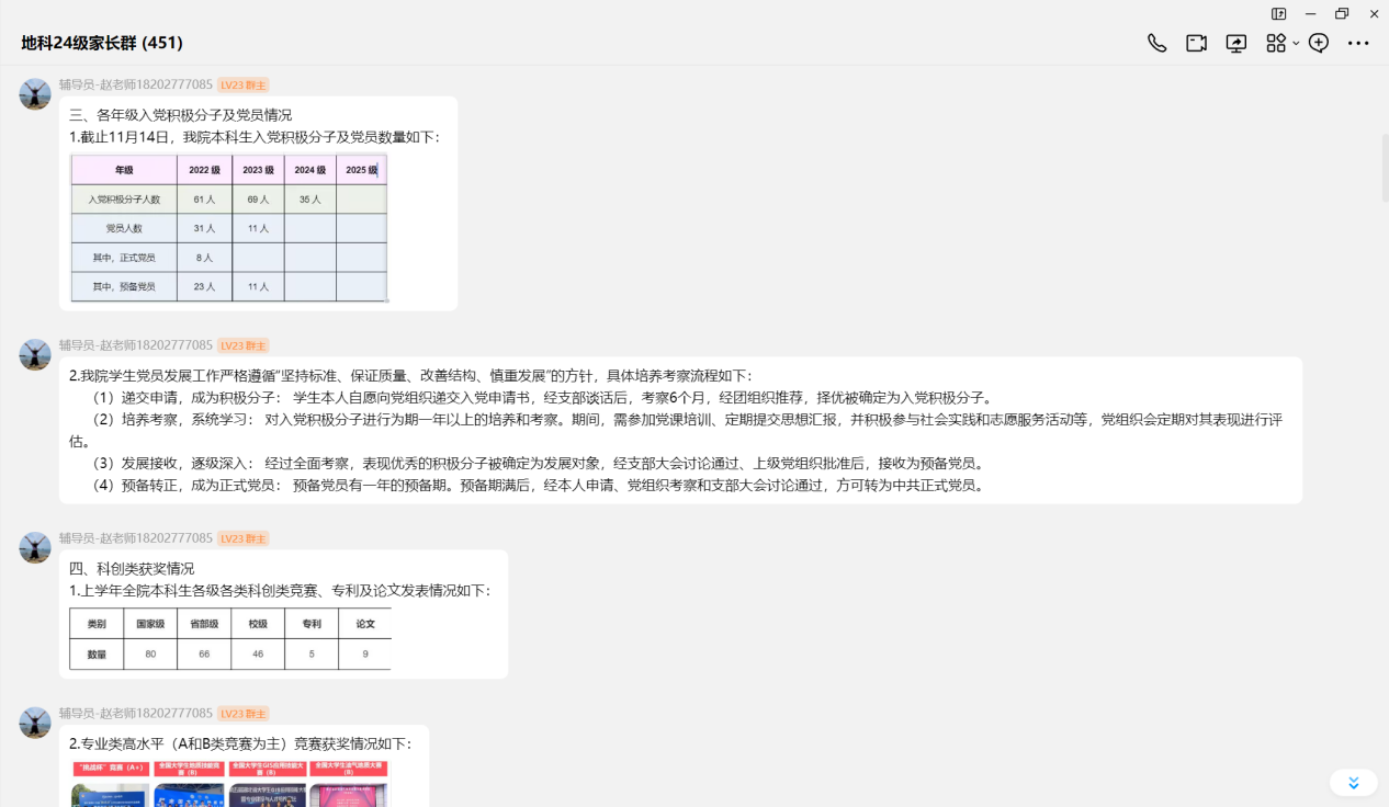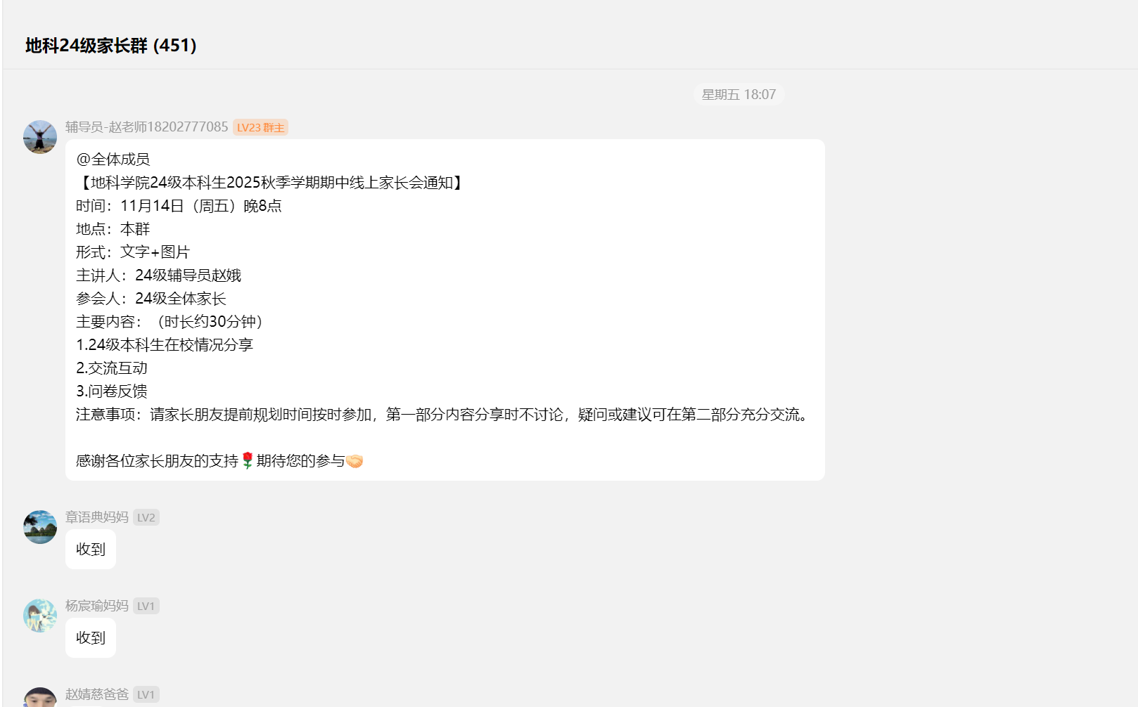 (通讯员 王彩蓓)为进一步加强家校之间的沟通与协作,构建家校共育的桥梁,共同促进学生全面成长与未来发展,11月14日晚8点,我院24级本科生本学期期中线上家长会顺利开展。会议由辅导员赵娥老师主讲,全体24级家长参与。