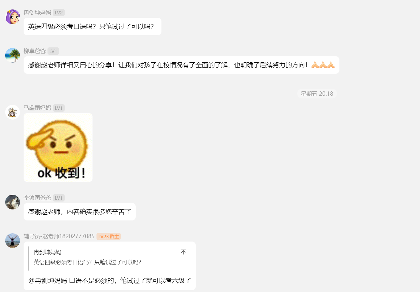 交流答疑环节,家长们就英语四六级、孩子专业以后的就业方向等问题踊跃提问,赵老师就家长们关心的问题进行了耐心、细致的解答,获得了家长们的一致好评。