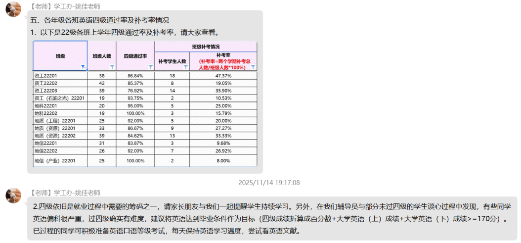 学业与日常管理情况是本次家长会的重点内容。学院针对各年级各班英语四级通过率及补考率进行精准分析,结合课堂检查记录,客观反馈学生的课堂学习状态;通过宿舍检查结果与生活场景描述,让家长深入了解学生的住宿环境与集体生活表现。尤为重要的是,会议专门通报了各年级学业预警情况与心理重点关注对象动态,为家校协同做好学业帮扶和心理疏导提供明确指向。此外,学院还结合2022级学生的年级特点,详细解读当前考研备考进度与就业指导安排,为家长参与升学就业规划提供参考。
