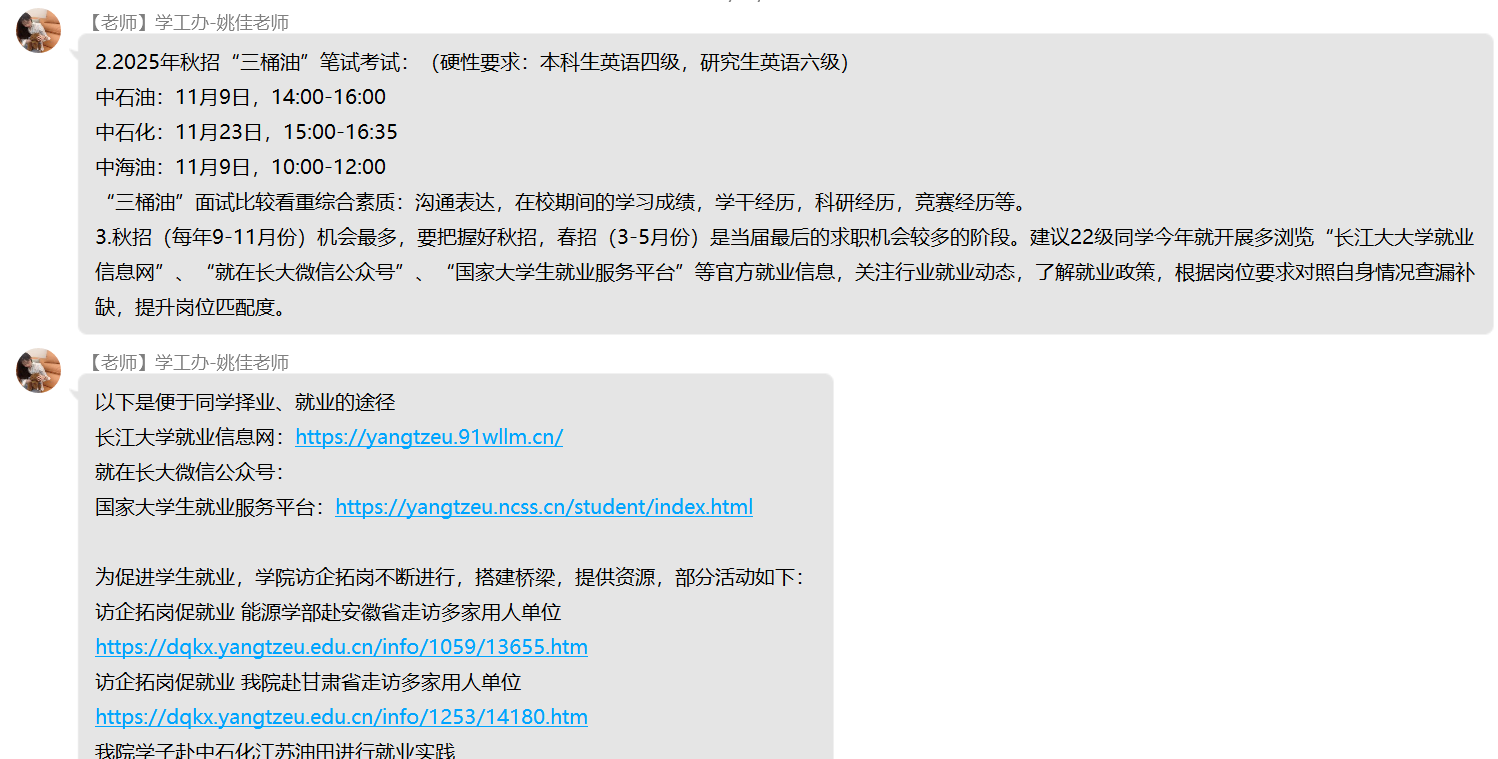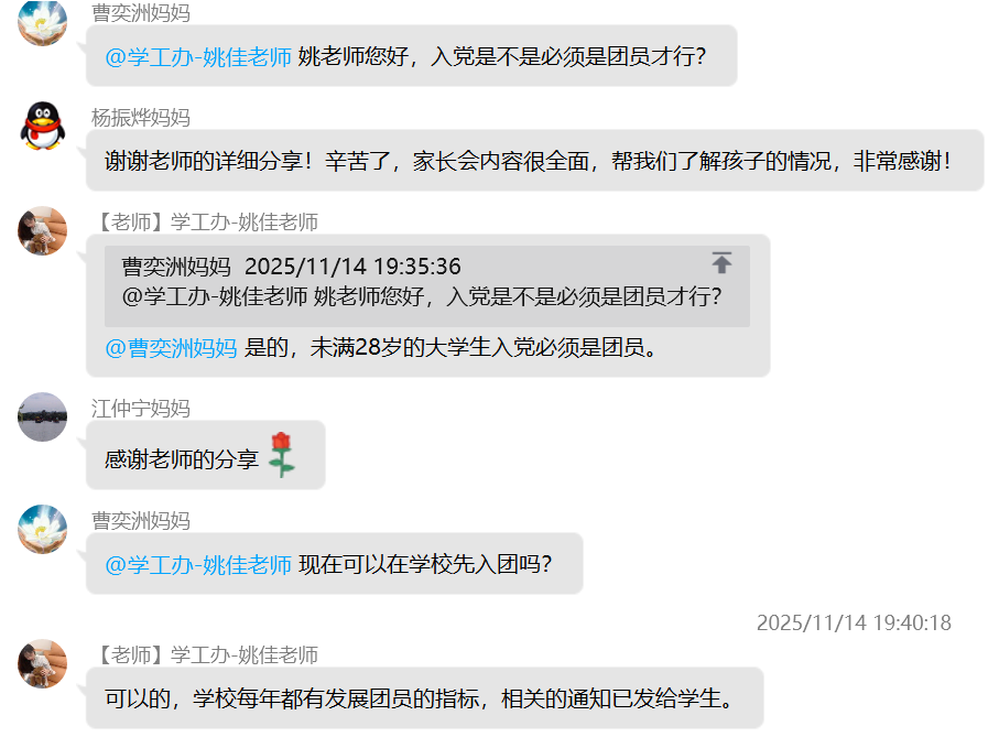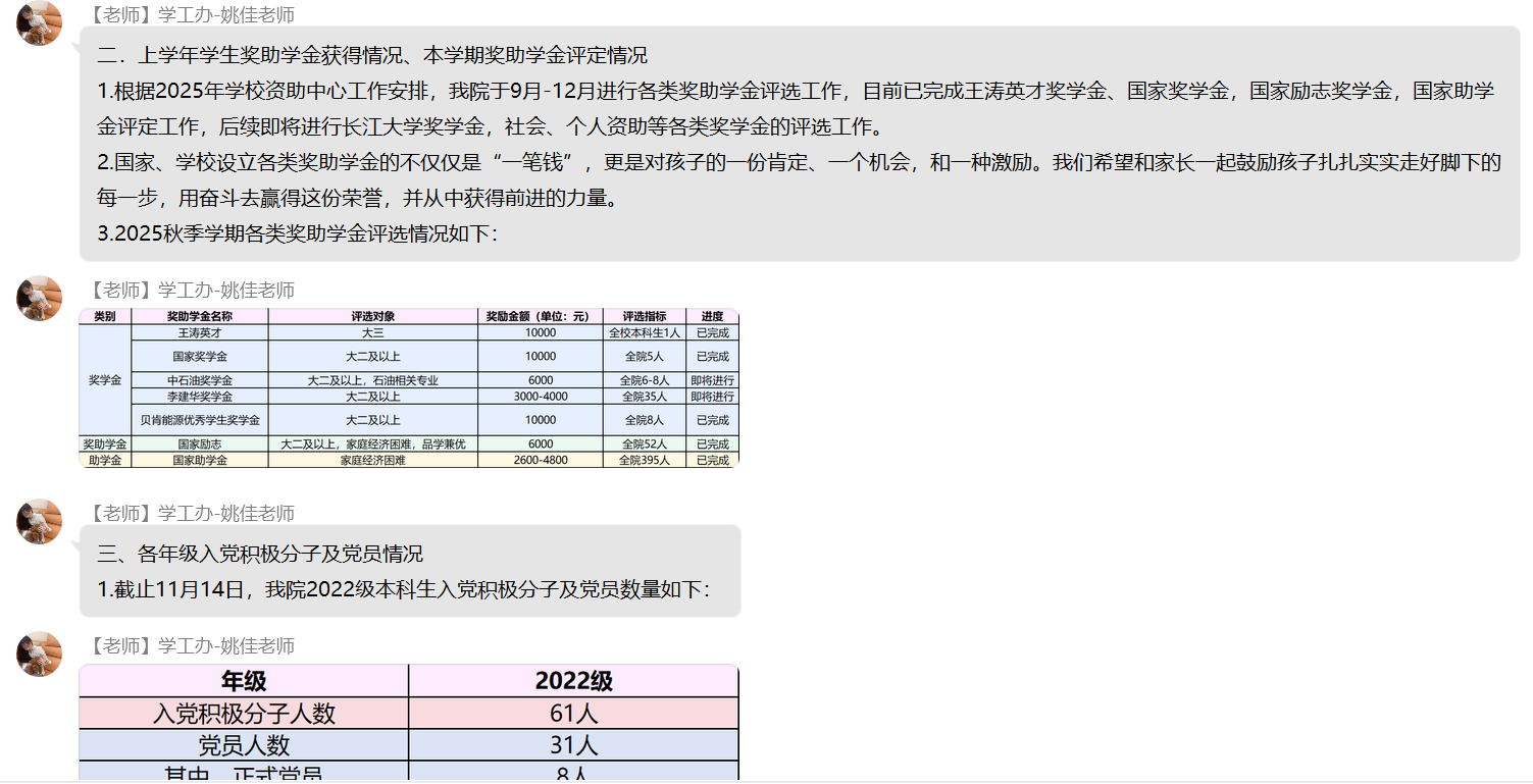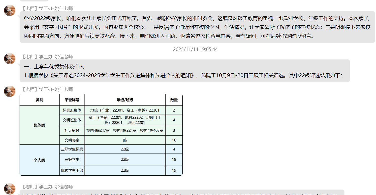 (通讯员 杨晟)为进一步加强家校沟通纽带,精准反馈学生在校动态,明确后续协同教育方向,11月17日晚七点,我院22级本科生线上家长会顺利召开。本次会议依托QQ群平台开展,采用“文字+图片”的组合呈现方式,确保信息传递直观高效,让全体家长全方位参与家校共育过程。