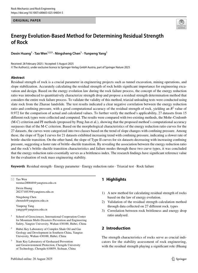 近日,地科学院2023级研究生黄德昕在期刊《Rock Mechanics and Rock Engineering》(最新影响因子为6.6,位列JCR分区一区,中科院大类一区)上发表论文“Energy Evolution-Based Method for Determining Residual Strength of Rock”。长江大学地球科学学院为论文第一署名单位,硕士研究生黄德昕为论文第一作者,其导师温韬教授为通讯作者。