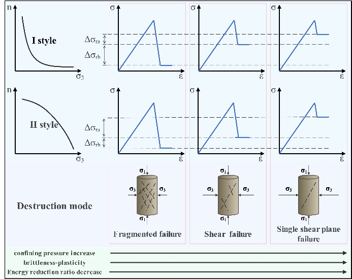 本文探究了岩石围压、脆性与本文提出的能量降比之间的关联规则,如图所示。随着围压增大,岩石承载能力逐渐变强,岩石破坏模式随之发生改变。岩石由脆性转向塑性的过程中,破坏模式由低围压下的碎散破坏、较低围压下的剪切破坏到高围压下的单剪破坏,破坏后岩石的完整程度增大。总体上,围压对岩石的变形破坏有重要影响,围压增大,岩石由脆性转为塑性,能量降比逐渐降低,岩石残余强度增大。研究成果可为实际相关工程提供参数支持。