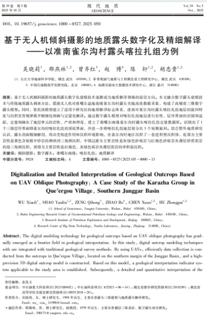 地球科学学院地质学专业2021级硕士研究生吴晓莉在中文核心期刊《现代地质》发表题为“基于无人机倾斜摄影的地质露头数字化及精细解译-以准南雀尔沟村露头喀拉扎组为例”的研究论文。长江大学地球科学学院为论文第一署名单位,硕士研究生吴晓莉为论文第一作者,导师邵燕林教授为通讯作者。