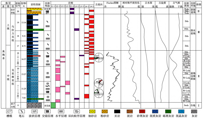 对桌子山地区开展野外露头实测、岩石地球化学特征分析,并结合前人已得的地球化学研究成果,对该区沉积环境演化特征进行了系统研究。综合分析认为:1)桌子山地区共划分出9种岩相4种岩相组合,根据成因分析得出4种主要的沉积类型:浅水台地沉积、等深流沉积、重力流沉积和深水原地沉积。2)桌子山组时期,海平面最低,古盐度较低,气候干热;克里摩里组时期,海平面持续上升,古盐度高,古水深大,气候湿热;乌拉力克组时期,海平面趋于平稳,气候向干热转变,古盐度变低;拉什仲组时期,海平面大幅下降,古盐度降低(图2)。