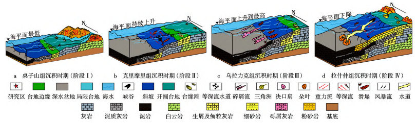 3)桌子山组以浅水台地沉积为主,受高温、低海平面影响,发育了一套巨厚的浅灰色白云质灰岩;克里摩里组以等深流沉积和深水原地沉积为主,部分发育重力流沉积,等深流水团因海平面和温度波动导致其驱动强度发生变化,发育了薄—中层深灰色泥晶灰岩夹深黑色泥岩;乌拉力克组主要发育深水原地沉积,伴有碎屑流沉积,受高海平面影响,水体稳定,以细粒沉积为主;拉什仲组发育浊流沉积和深水原地沉积,受海平面下降影响,重力流沿斜坡向下搬运物源并发育一套灰绿色砂岩(图3)。