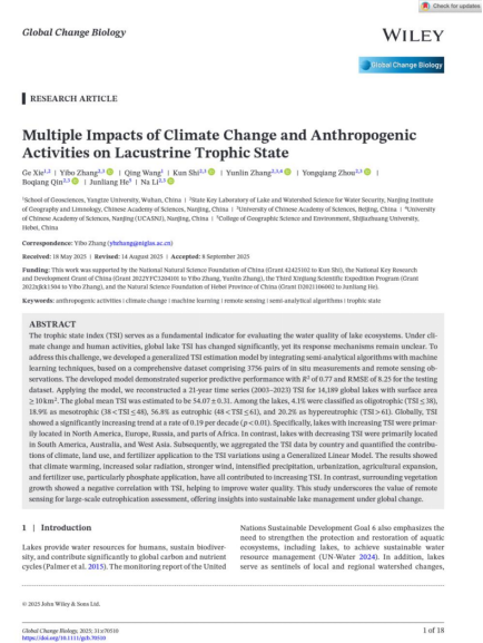 论文信息:Xie, G., Y. Zhang, Q. Wang, et al. 2025. “ Multiple Impacts of Climate Change and Anthropogenic Activities on Lacustrine Trophic State.” Global Change Biology 31, no. 9: e70510. https://doi.org/10.1111/gcb.70510.